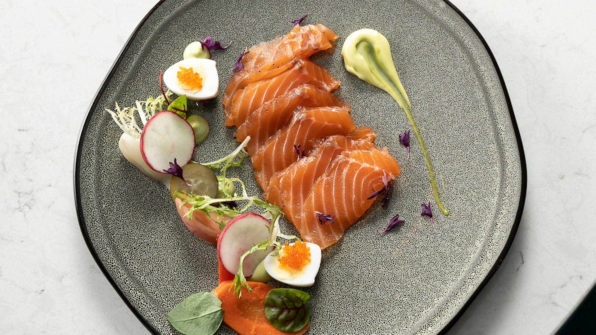 Faire un trait avec une mayonnaise aromatisée soit aux herbes ou citron selon vos goûts sur le côté du gravlax.