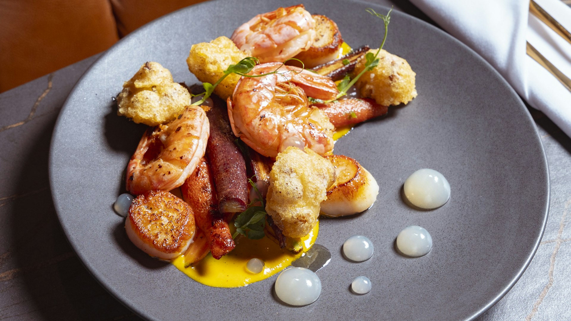 This dish combines scallops, shrimp, tempura vegetables, yellow pepper purée, and grape gel with acérum, creating a perfect harmony between land and sea, elevated by the unique flavors of Quebec’s terroir.