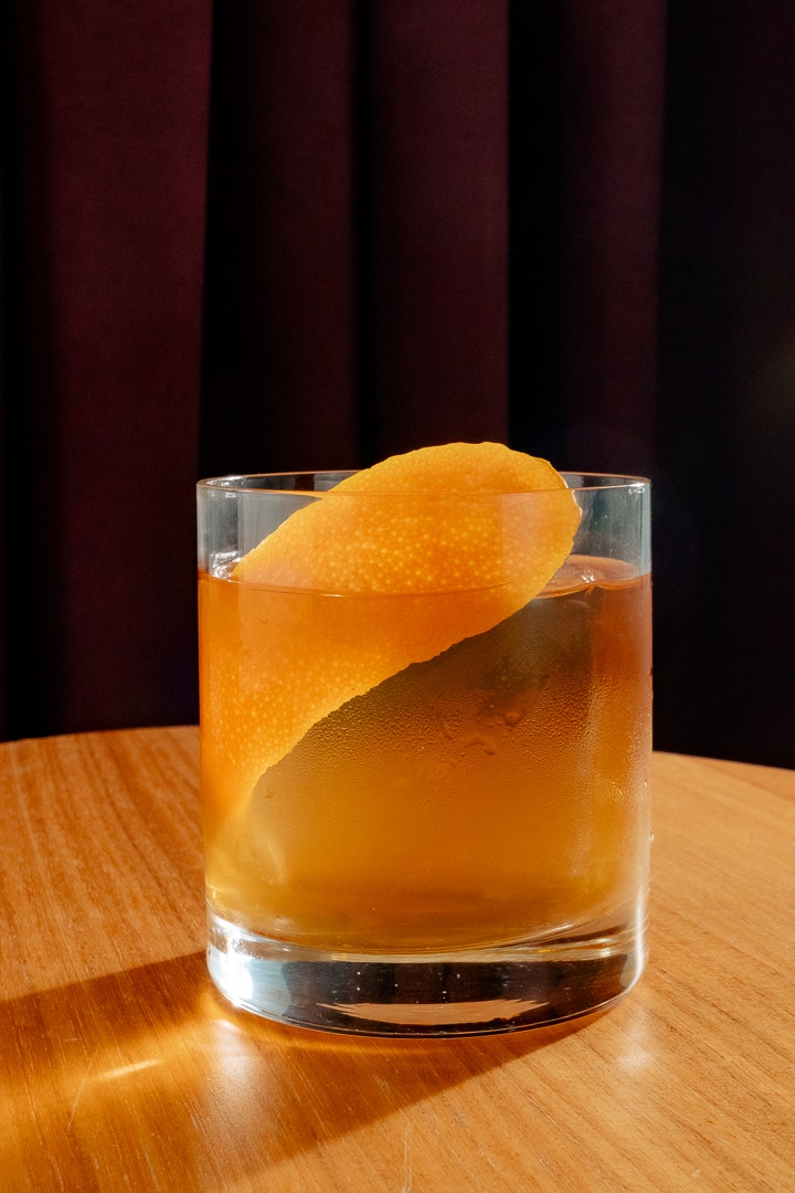 - In a lowball glass with a few ice cubes, combine all the ingredients except the orange zest.